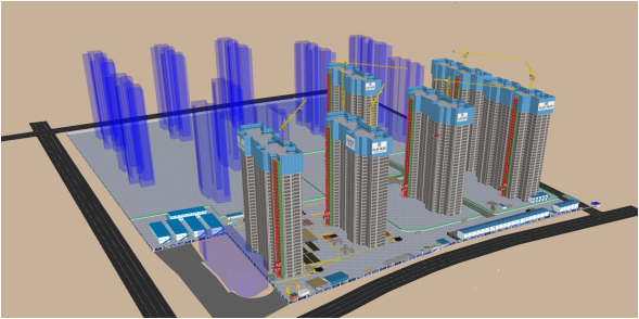 使用BIM技术模拟现场施工环境,根据不同工况对总平面布置实时进行动态调整,在节约资源的同时保证了现场施工有序性,针对施工场地狭窄的难点,合理进行场地布置,确定转场方案。