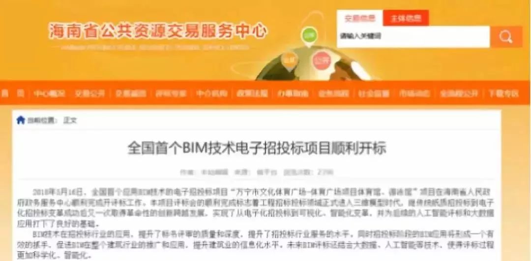 近期,全国首个应用BIM技术的电子招投标项目“万宁市文化体育广场-体育广场项目体育馆、游泳馆”项目在海南省人民政府政务服务中心顺利完成开评标工作。该项目评标会的顺利完成,标志着工程招标投标领域正式进入三维模型时代,继传统纸质招投标到电子化招投标变革成功后又一次取得革命性的创新跨越发展,实现了从电子化招投标到可视化、智能化变革,并为后续的人工智能评标和大数据应用打下了良好的基础。