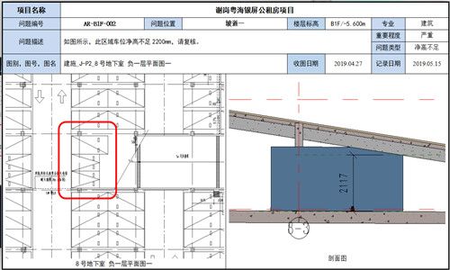 车位梁下净高为2117mm(未扣除建筑完成面厚度),存在不满足2200mm净高要求问题。如下图: